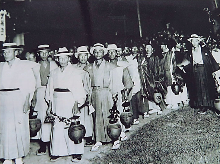 昭和初期とみられる氏子総代と神輿行列