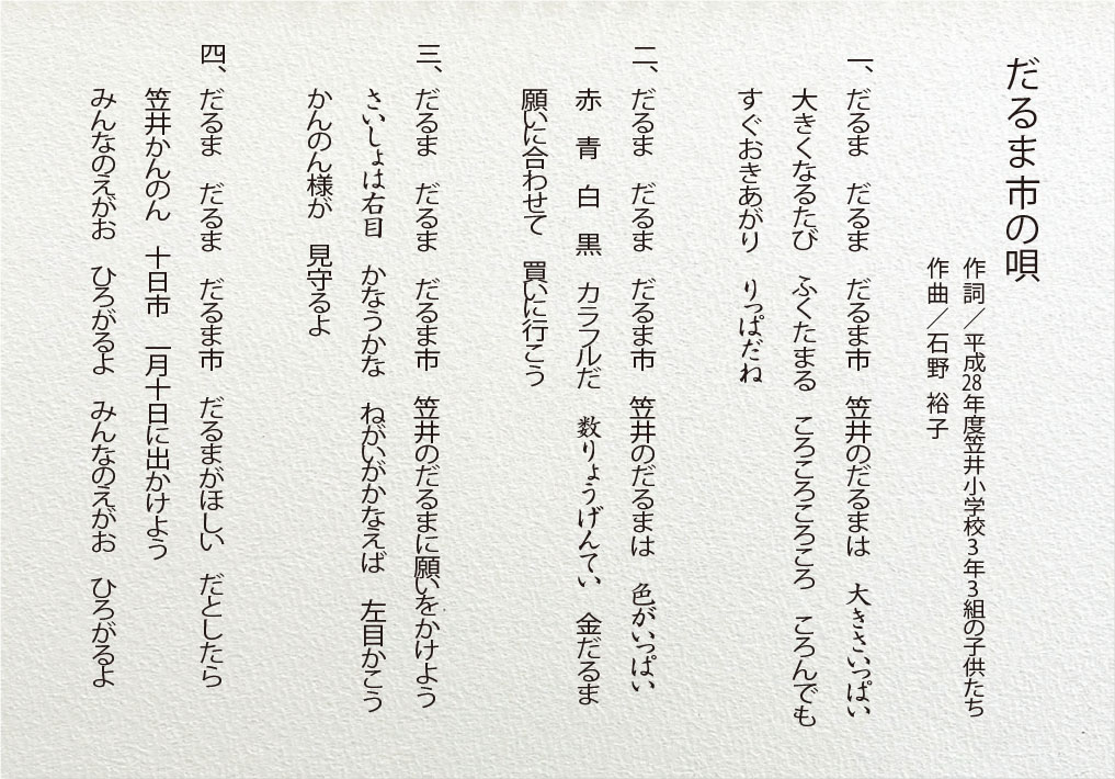 「だるま だるま だるま市 笠井のだるまは 大きさいっぱい 大きくなるたび ふくたまる ころころころころ ころんでも すぐおきあがり りっぱだね」